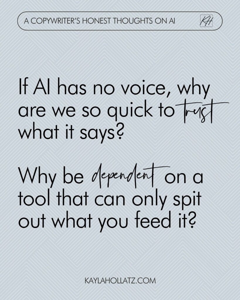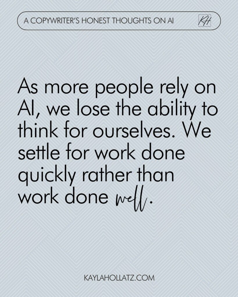I also find it interesting how many business gurus have changed their tune over time. The same influencers who made millions off of telling us to discover our voice and embrace what makes us unique are now the first ones selling courses on AI copywriting. I can’t be the only one seeing the irony in this, right?